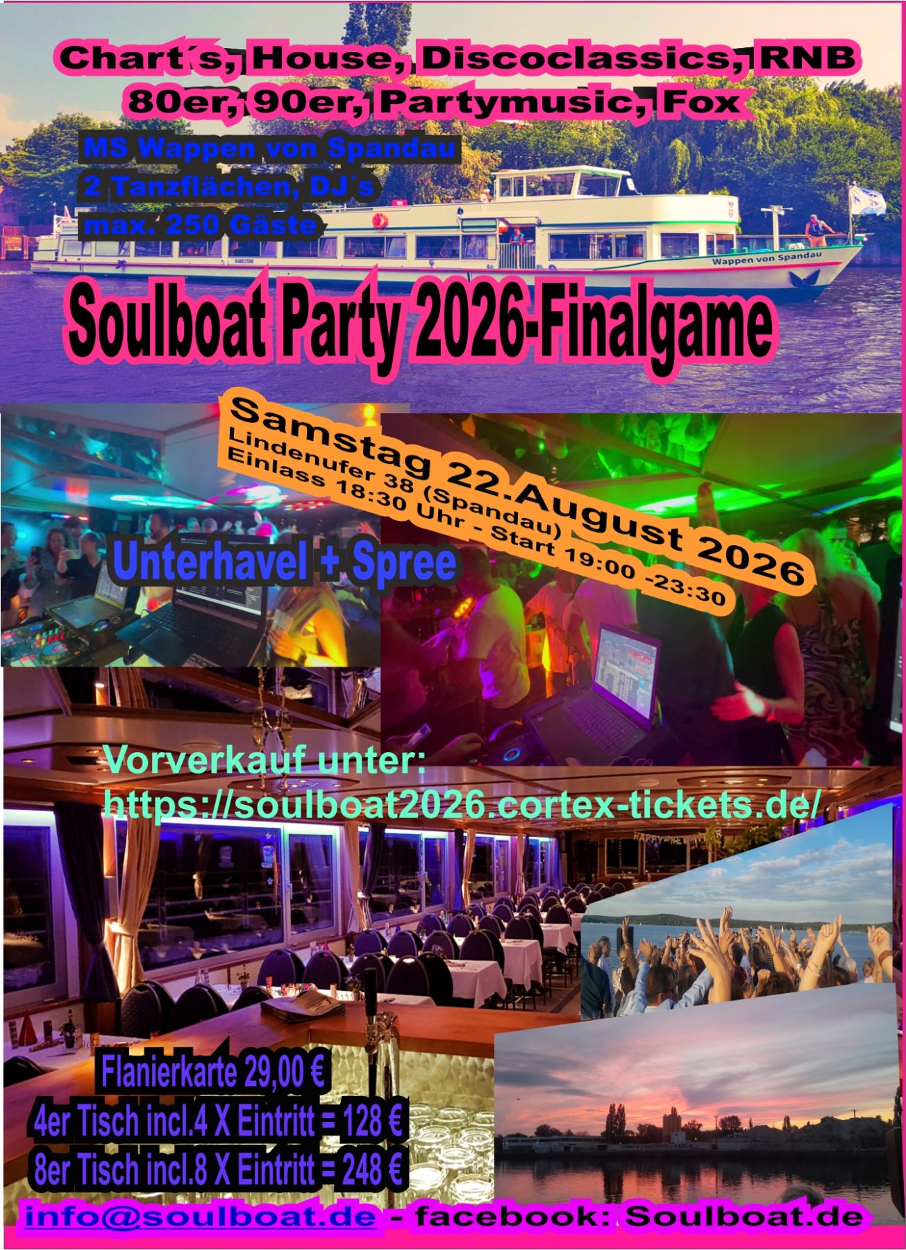 Buy tickets online. Advance sale from 22.03.2026 till 21.08.2026 Tickets for Soulboat 2026 FinalgameDie berühmten Bootspartys in BerlinMS Wappen von Spandau, Berlin Lindenufer 38Admission at 18:30 o'clock